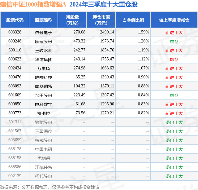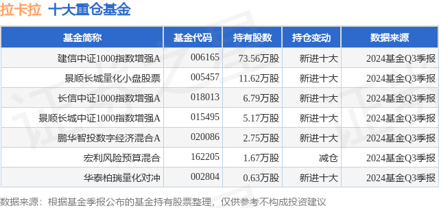 根据2024基金Q3季报公募基金重仓股数据,重仓该股的公募基金共7家,其中持有数量最多的公募基金为建信中证1000指数增强A。建信中证1000指数增强A目前规模为9.15亿元,最新净值1.5596(11月28日),较上一交易日下跌0.4%,近一年上涨0.85%。该公募基金现任基金经理为叶乐天 赵云煜。叶乐天在任的基金产品包括:建信央视财经50指数(LOF),管理时间为2013年3月28日至今,期间收益率为195.22%;建信中证500指数增强A,管理时间为2014年1月27日至今,期间收益率为155.46%;建信精工制造指数增强,管理时间为2015年8月26日至今,期间收益率为78.08%;建信多因子量化股票,管理时间为2016年8月9日至今,期间收益率为33.22%。赵云煜在任的基金产品包括:建信中证红利潜力指数A,管理时间为2019年9月11日至今,期间收益率为37.69%;建信MSCI中国A股指数增强A,管理时间为2019年11月13日至今,期间收益率为43.12%。