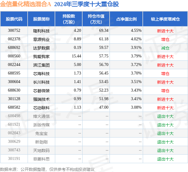 根据2024基金Q3季报公募基金重仓股数据,重仓该股的公募基金共1家,其中持有数量最多的公募基金为金信量化精选混合A。金信量化精选混合A目前规模为0.15亿元,最新净值0.9359(11月28日),较上一交易日上涨0.47%,近一年上涨1.64%。该公募基金现任基金经理为谭佳俊。