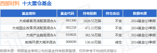 根据2024基金Q3季报公募基金重仓股数据,重仓该股的公募基金共4家,其中持有数量最多的公募基金为大成睿景灵活配置混合A。大成睿景灵活配置混合A目前规模为22.27亿元,最新净值2.068(12月17日),较上一交易日下跌0.72%,近一年上涨12.64%。该公募基金现任基金经理为韩创。韩创在任的基金产品包括:大成新锐产业混合A,管理时间为2019年1月10日至今,期间收益率为283.28%;大成国企改革灵活配置混合A,管理时间为2021年1月13日至今,期间收益率为57.65%;大成产业趋势混合A,管理时间为2021年2月9日至今,期间收益率为33.74%。