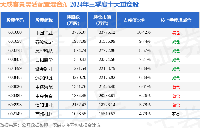 大成睿景灵活配置混合A的前十大重仓股如下:
