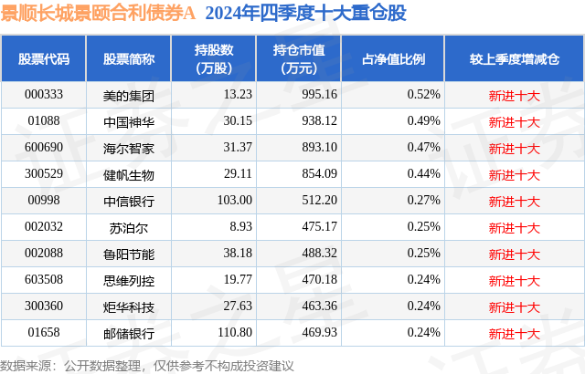 根据2024基金年报公募基金重仓股数据,重仓该股的公募基金共8家,其中持有数量最多的公募基金为景顺长城景颐合利债券A。景顺长城景颐合利债券A目前规模为7.1亿元,最新净值0.9991(2月18日),较上一交易日下跌0.14%。该公募基金现任基金经理为毛从容 张靖。毛从容在任的基金产品包括:景顺长城90天持有短债A,管理时间为2023年9月23日至今,期间收益率为4.05%;景顺长城景颐裕利债券A,管理时间为2023年11月16日至今,期间收益率为5.81%;张靖在任的基金产品包括:景顺长城策略精选灵活配置混合A,管理时间为2014年10月25日至今,期间收益率为285.6%;景顺长城中小创精选股票A,管理时间为2022年11月19日至今,期间收益率为7.73%;景顺长城中小盘混合A,管理时间为2022年11月19日至今,期间收益率为9.51%;景顺长城成长趋势股票A,管理时间为2023年7月25日至今,期间收益率为1.82%。