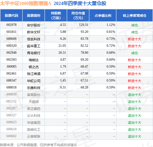 太平中证1000指数增强A的前十大重仓股如下:
