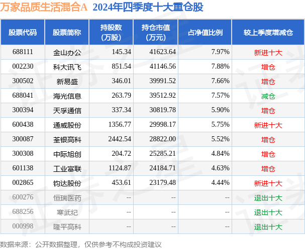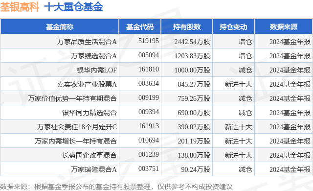 根据2024基金年报公募基金重仓股数据,重仓该股的公募基金共12家,其中持有数量最多的公募基金为万家品质生活混合A。万家品质生活混合A目前规模为41.13亿元,最新净值2.9991(2月24日),较上一交易日下跌0.1%,近一年上涨34.97%。该公募基金现任基金经理为莫海波。莫海波在任的基金产品包括:万家和谐增长混合A,管理时间为2015年5月6日至今,期间收益率为187.65%;万家新兴蓝筹A,管理时间为2016年1月26日至今,期间收益率为315.24%;万家臻选混合A,管理时间为2017年12月20日至今,期间收益率为203.27%。
