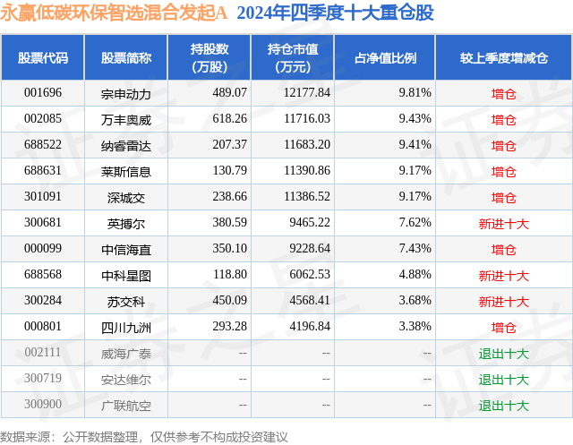 永赢低碳环保智选混合发起A的前十大重仓股如下: