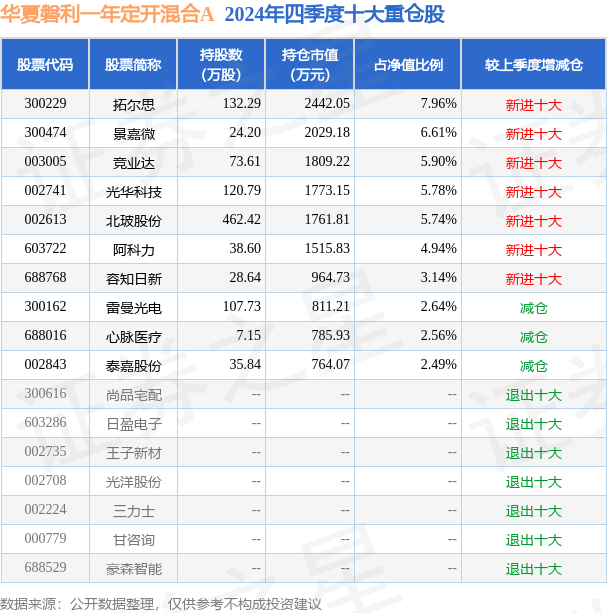 华夏磐利一年定开混合A的前十大重仓股如下: