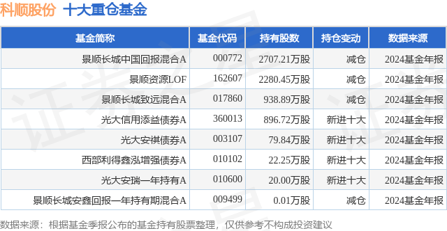 根据2024基金年报公募基金重仓股数据,重仓该股的公募基金共8家,其中持有数量最多的公募基金为景顺长城基金的景顺长城中国回报混合A。景顺长城中国回报混合A目前规模为14.14亿元,最新净值1.39(3月7日),较上一交易日上涨0.36%,近一年上涨18.3%。该公募基金现任基金经理为韩文强。韩文强在任的基金产品包括:景顺长城资源垄断混合(LOF)A,管理时间为2020年4月29日至今,期间收益率为12.58%;景顺长城安鑫回报一年持有期混合A,管理时间为2020年7月10日至今,期间收益率为10.59%;景顺长城致远混合A,管理时间为2023年2月28日至今,期间收益率为-19.49%。