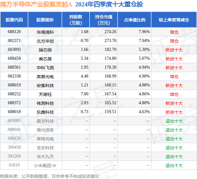 根据2024基金年报公募基金重仓股数据,重仓该股的公募基金共3家,其中持有数量最多的公募基金为南方基金的南方半导体产业股票发起A。南方半导体产业股票发起A目前规模为0.25亿元,最新净值1.4951(3月7日),较上一交易日下跌0.94%。该公募基金现任基金经理为郑晓曦。郑晓曦在任的基金产品包括:南方信息创新混合A,管理时间为2019年6月19日至今,期间收益率为91.35%;南方科创板3年定开混合,管理时间为2024年1月12日至今,期间收益率为45.58%;