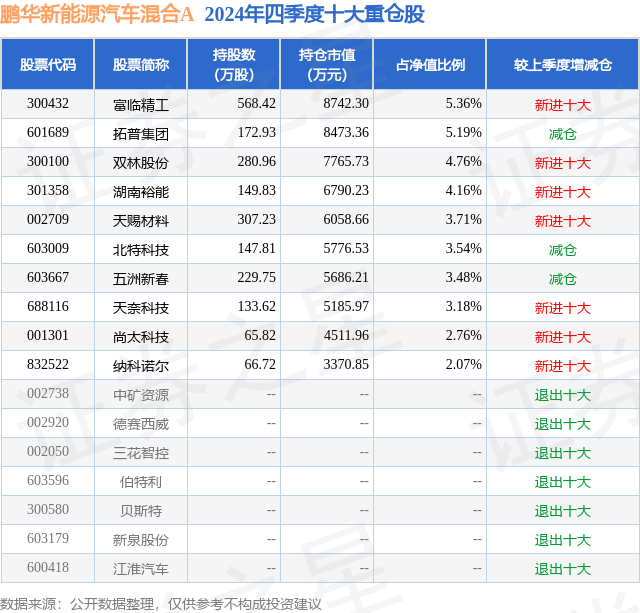 鹏华新能源汽车混合A的前十大重仓股如下: