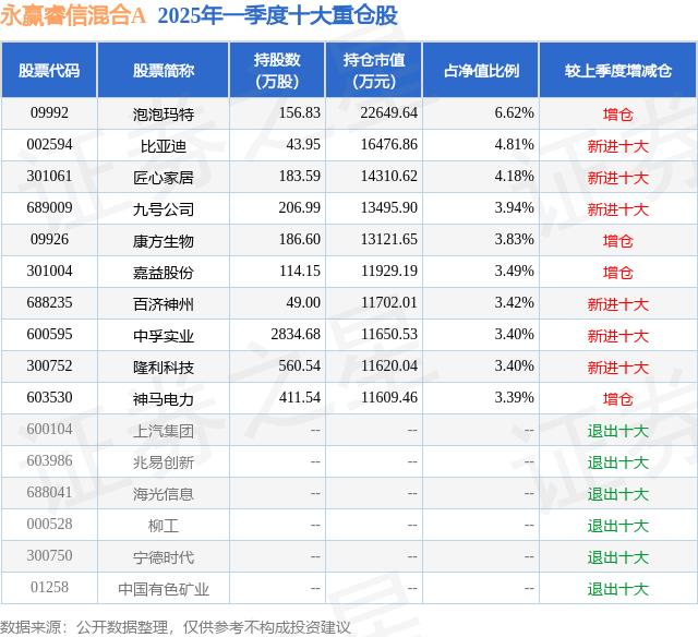 永赢睿信混合A的前十大重仓股如下: