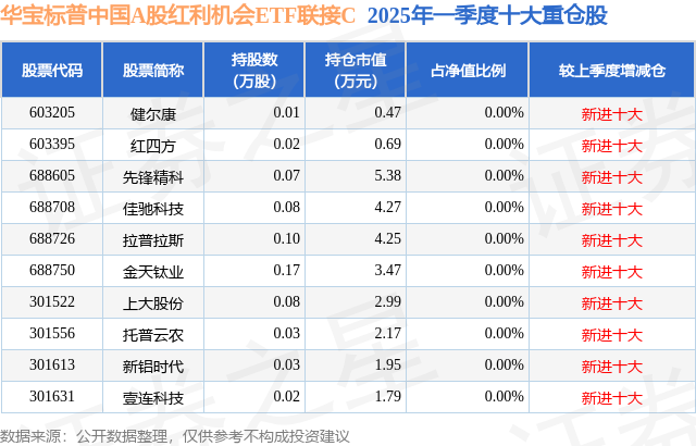 根据2025基金Q1季报公募基金重仓股数据,重仓该股的公募基金共3家,其中持有数量最多的公募基金为华宝基金的华宝标普中国A股红利机会ETF联接C。华宝标普中国A股红利机会ETF联接C目前规模为1.88亿元,最新净值1.6093(6月17日),较上一交易日下跌0.32%,近一年上涨8.09%。该公募基金现任基金经理为胡洁 胡一江。胡洁在任的基金产品包括:华宝中证银行ETF联接A,管理时间为2012年10月16日至今,期间收益率为184.17%;华宝医疗ETF联接A,管理时间为2015年5月21日至今,期间收益率为-63.42%;华宝中证军工ETF,管理时间为2016年8月5日至今,期间收益率为21.97%;华宝中证银行ETF,管理时间为2017年7月18日至今,期间收益率为66.22%。胡一江在任的基金产品包括:华宝中证800红利低波动ETF,管理时间为2025年1月18日至今,期间收益率为3.94%;华宝标普中国A股红利机会ETF,管理时间为2025年1月18日至今,期间收益率为8.03%;华宝沪深300自由现金流ETF,管理时间为2025年4月7日至今,期间收益率为5.35%。