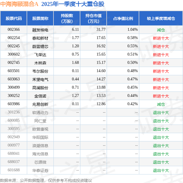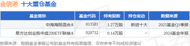 根据2025基金Q1季报公募基金重仓股数据,重仓该股的公募基金共1家,其中持有数量最多的公募基金为中海基金的中海海颐混合A。中海海颐混合A目前规模为0.27亿元,最新净值0.9816(6月19日),较上一交易日下跌0.22%,近一年上涨3.89%。该公募基金现任基金经理为殷婧 时奕。殷婧在任的基金产品包括:中海增强收益债券A,管理时间为2021年11月5日至今,期间收益率为8.21%;中海纯债债券A,管理时间为2024年9月23日至今,期间收益率为1.92%;中海丰泽利率债A,管理时间为2024年11月15日至今,期间收益率为1.45%。时奕在任的基金产品包括:中海混改红利混合A,管理时间为2024年6月29日至今,期间收益率为-3.9%;中海沪港深价值优选混合A,管理时间为2024年9月24日至今,期间收益率为28.33%;中海优势精选灵活配置混合,管理时间为2025年4月15日至今,期间收益率为7.14%;