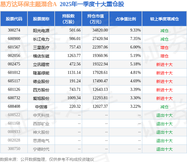 易方达环保主题混合A的前十大重仓股如下: