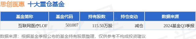 根据2024基金Q3季报公募基金重仓股数据,重仓该股的公募基金共1家,其中持有数量最多的公募基金为互联网医疗LOF。互联网医疗LOF目前规模为0.46亿元,最新净值0.9025(11月26日),较上一交易日下跌1.19%,近一年下跌12.51%。该公募基金现任基金经理为吴振翔。吴振翔在任的基金产品包括:汇添富上证综合指数A,管理时间为2010年2月6日至今,期间收益率为55.72%;汇添富沪深300安中指数A,管理时间为2013年11月6日至今,期间收益率为138.21%;汇添富中证精准医疗指数(LOF)C,管理时间为2016年1月21日至今,期间收益率为-24.06%;汇添富中证上海国企ETF,管理时间为2016年7月28日至今,期间收益率为83.81%。