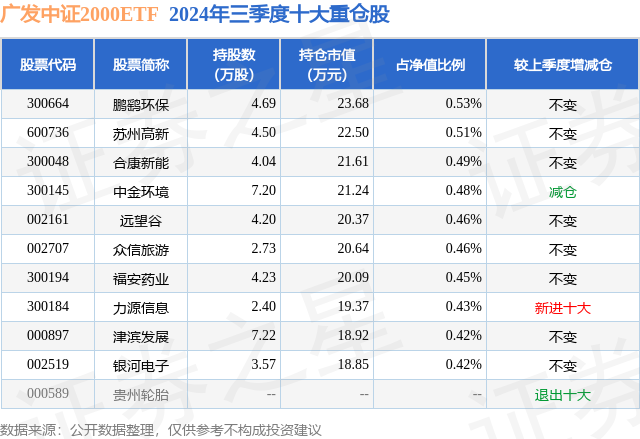 根据2024基金Q3季报公募基金重仓股数据,重仓该股的公募基金共1家,其中持有数量最多的公募基金为广发中证2000ETF。广发中证2000ETF目前规模为0.45亿元,最新净值1.096(11月27日),较上一交易日上涨1.65%,近一年上涨5.17%。该公募基金现任基金经理为夏浩洋。夏浩洋在任的基金产品包括:广发中证光伏产业指数A,管理时间为2021年7月6日至今,期间收益率为-39.01%;广发海外中国互联网30(QDII-ETF),管理时间为2021年11月24日至今,期间收益率为-11.98%;广发中证光伏龙头30ETF,管理时间为2022年11月24日至今,期间收益率为-46.78%;广发中证环保ETF联接A,管理时间为2023年5月15日至今,期间收益率为-17.69%。