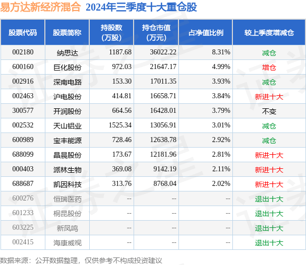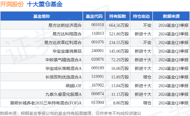 根据2024基金Q3季报公募基金重仓股数据,重仓该股的公募基金共15家,其中持有数量最多的公募基金为易方达新经济混合。易方达新经济混合目前规模为43.34亿元,最新净值3.214(11月27日),较上一交易日上涨2.45%,近一年下跌3.37%。该公募基金现任基金经理为陈皓。陈皓在任的基金产品包括:易方达平稳增长混合,管理时间为2012年9月28日至今,期间收益率为287.83%;易方达科翔混合,管理时间为2014年5月10日至今,期间收益率为365.58%;易方达均衡成长股票,管理时间为2020年5月22日至今,期间收益率为-12.59%。