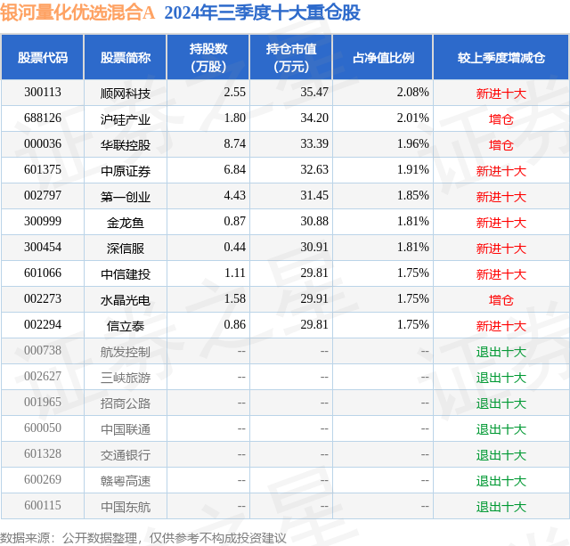 根据2024基金Q3季报公募基金重仓股数据,重仓该股的公募基金共1家,其中持有数量最多的公募基金为银河量化优选混合A。银河量化优选混合A目前规模为0.17亿元,最新净值1.9396(11月27日),较上一交易日上涨1.37%,近一年上涨13.46%。该公募基金现任基金经理为罗博。罗博在任的基金产品包括:银河沪深300价值指数A,管理时间为2009年12月28日至今,期间收益率为108.42%;银河量化稳进混合,管理时间为2021年2月24日至今,期间收益率为-5.47%;银河沪深300指数增强A,管理时间为2021年6月7日至今,期间收益率为-13.34%。