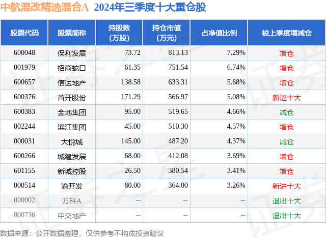 根据2024基金Q3季报公募基金重仓股数据,重仓该股的公募基金共1家,其中持有数量最多的公募基金为中航混改精选混合A。中航混改精选混合A目前规模为0.15亿元,最新净值0.9525(11月27日),较上一交易日上涨2.2%,近一年下跌30.02%。该公募基金现任基金经理为方岑 邓海清。