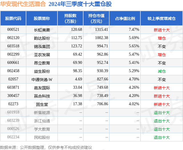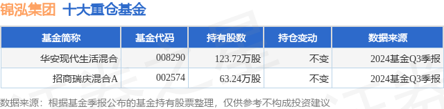 根据2024基金Q3季报公募基金重仓股数据,重仓该股的公募基金共2家,其中持有数量最多的公募基金为华安现代生活混合。华安现代生活混合目前规模为1.76亿元,最新净值0.832(11月27日),较上一交易日上涨2.09%,近一年下跌4.39%。该公募基金现任基金经理为刘淑生。