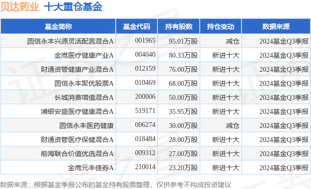 重仓贝达药业的前十大公募基金请见下表: