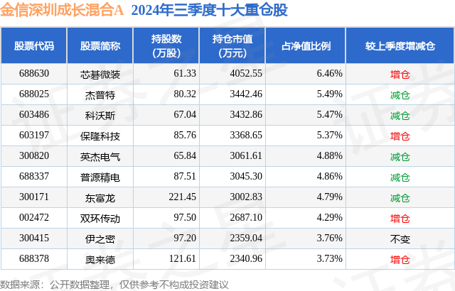 根据2024基金Q3季报公募基金重仓股数据,重仓该股的公募基金共3家,其中持有数量最多的公募基金为金信深圳成长混合A。金信深圳成长混合A目前规模为2.06亿元,最新净值2.5662(11月28日),较上一交易日下跌0.33%,近一年下跌4.09%。该公募基金现任基金经理为黄飙。黄飙在任的基金产品包括:金信优质成长混合A,管理时间为2023年4月12日至今,期间收益率为8.11%。