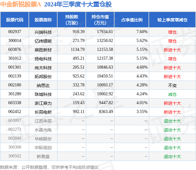 根据2024基金Q3季报公募基金重仓股数据,重仓该股的公募基金共4家,其中持有数量最多的公募基金为中金新锐股票A。中金新锐股票A目前规模为19.26亿元,最新净值3.9086(11月29日),较上一交易日上涨1.16%,近一年上涨8.34%。该公募基金现任基金经理为朱剑胜。朱剑胜在任的基金产品包括:中金精选股票A,管理时间为2022年7月1日至今,期间收益率为-17.51%。
