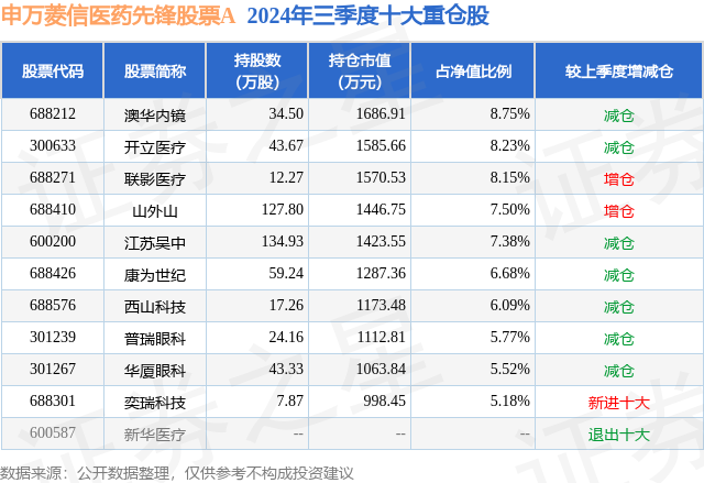 根据2024基金Q3季报公募基金重仓股数据,重仓该股的公募基金共6家,其中持有数量最多的公募基金为申万菱信医药先锋股票A。申万菱信医药先锋股票A目前规模为1.61亿元,最新净值0.5712(11月29日),较上一交易日上涨1.28%,近一年下跌26.75%。该公募基金现任基金经理为姚宏福。
