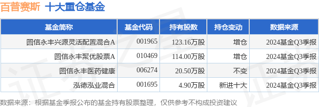 根据2024基金Q3季报公募基金重仓股数据,重仓该股的公募基金共4家,其中持有数量最多的公募基金为圆信永丰兴源灵活配置混合A。圆信永丰兴源灵活配置混合A目前规模为4.15亿元,最新净值1.8242(11月29日),较上一交易日上涨2.14%,近一年下跌6.84%。该公募基金现任基金经理为肖世源。肖世源在任的基金产品包括:圆信永丰医药健康,管理时间为2018年11月29日至今,期间收益率为79.24%;圆信永丰聚优股票A,管理时间为2024年4月3日至今,期间收益率为15.94%。