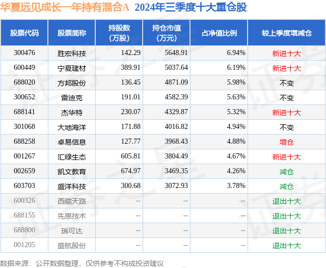 华夏远见成长一年持有混合A的前十大重仓股如下: