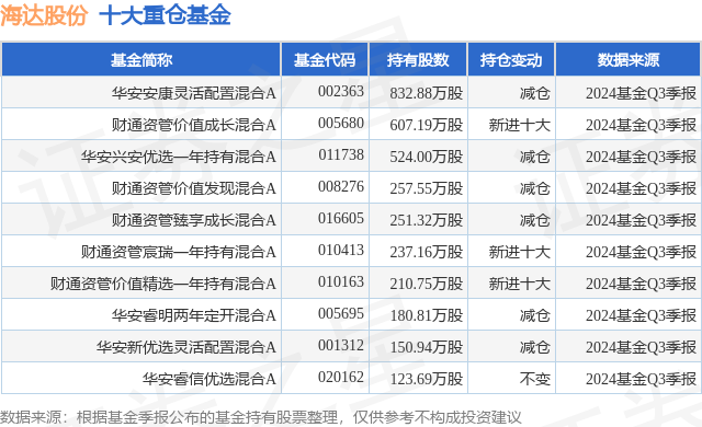 根据2024基金Q3季报公募基金重仓股数据,重仓该股的公募基金共14家,其中持有数量最多的公募基金为华安安康灵活配置混合A。华安安康灵活配置混合A目前规模为40.3亿元,最新净值1.7678(11月29日),较上一交易日上涨0.41%,近一年上涨9.21%。该公募基金现任基金经理为石雨欣 陆奔。石雨欣在任的基金产品包括:华安稳固收益债券A,管理时间为2016年3月22日至今,期间收益率为93.81%;华安添祥6个月持有混合A,管理时间为2021年7月23日至今,期间收益率为11.34%;华安鼎安优选一年持有混合A,管理时间为2022年6月2日至今,期间收益率为-2.97%。陆奔在任的基金产品包括:华安新优选灵活配置混合A,管理时间为2020年1月23日至今,期间收益率为34.51%;华安睿明两年定开混合A,管理时间为2020年1月23日至今,期间收益率为97.53%;华安添瑞6个月混合A,管理时间为2020年6月22日至今,期间收益率为20.98%。