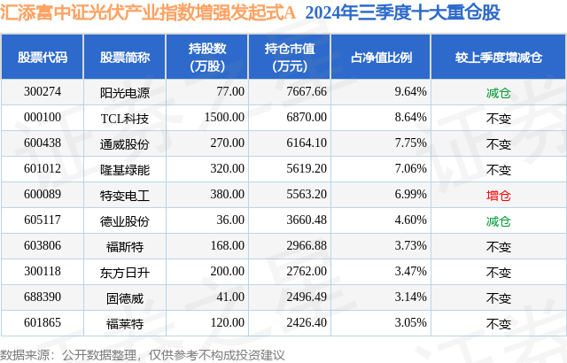 汇添富中证光伏产业指数增强发起式A的前十大重仓股如下: