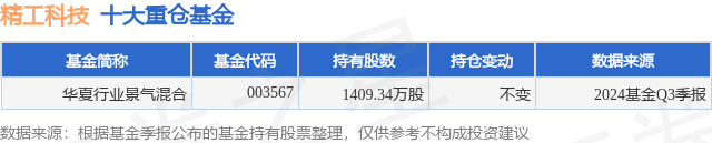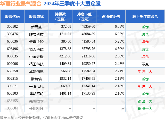 根据2024基金Q3季报公募基金重仓股数据,重仓该股的公募基金共1家,其中持有数量最多的公募基金为华夏行业景气混合。华夏行业景气混合目前规模为79.51亿元,最新净值3.1537(12月2日),较上一交易日上涨1.67%,近一年上涨13.97%。该公募基金现任基金经理为钟帅。钟帅在任的基金产品包括:华夏远见成长一年持有混合A,管理时间为2022年9月20日至今,期间收益率为-8.78%;华夏招鑫鸿瑞混合A,管理时间为2024年1月16日至今,期间收益率为32.94%。