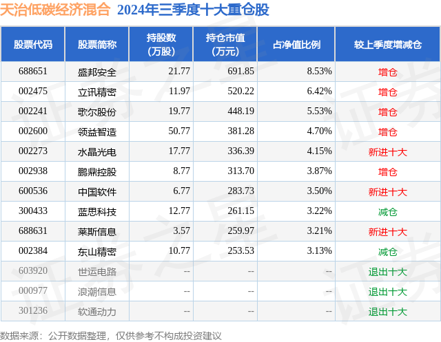 天治低碳经济混合的前十大重仓股如下: