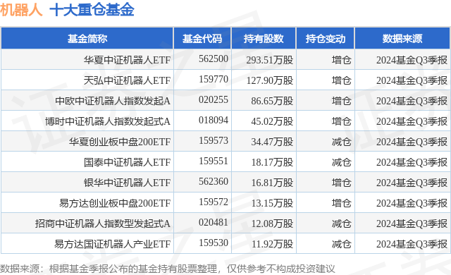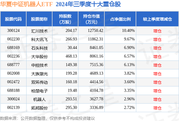根据2024基金Q3季报公募基金重仓股数据,重仓该股的公募基金共17家,其中持有数量最多的公募基金为华夏中证机器人ETF。华夏中证机器人ETF目前规模为12.26亿元,最新净值0.8091(12月3日),较上一交易日下跌0.31%,近一年上涨6.03%。该公募基金现任基金经理为华龙。华龙在任的基金产品包括:华夏饲料豆粕期货ETF联接A,管理时间为2022年8月22日至今,期间收益率为12.17%;华夏上证50AH优选指数A,管理时间为2022年8月22日至今,期间收益率为1.48%;华夏中证机器人ETF发起式联接A,管理时间为2023年5月31日至今,期间收益率为-0.34%;华夏国证消费电子主题ETF发起式联接A,管理时间为2023年6月2日至今,期间收益率为17.82%。