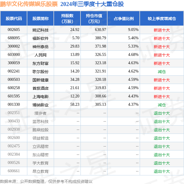 鹏华文化传媒娱乐股票的前十大重仓股如下: