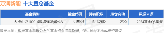 根据2024基金Q3季报公募基金重仓股数据,重仓该股的公募基金共1家,其中持有数量最多的公募基金为大成中证1000指数增强发起式A。大成中证1000指数增强发起式A目前规模为0.77亿元,最新净值1.0782(12月3日),较上一交易日上涨0.34%,近一年上涨9.65%。该公募基金现任基金经理为苏秉毅 刘旺。苏秉毅在任的基金产品包括:大成核心双动力混合A,管理时间为2016年3月4日至今,期间收益率为74.05%;大成景恒混合A,管理时间为2018年6月26日至今,期间收益率为162.12%;大成卓享一年持有混合A,管理时间为2023年4月25日至今,期间收益率为4.96%;刘旺在任的基金产品包括:大成沪深300增强发起式A,管理时间为2024年1月2日至今,期间收益率为15.53%;