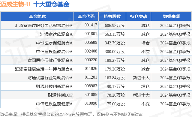 根据2024基金Q3季报公募基金重仓股数据,重仓该股的公募基金共30家,其中持有数量最多的公募基金为汇添富医疗服务灵活配置混合A。汇添富医疗服务灵活配置混合A目前规模为30.38亿元,最新净值1.369(12月3日),较上一交易日上涨0.29%,近一年上涨4.03%。该公募基金现任基金经理为张韡。张韡在任的基金产品包括:汇添富健康生活一年持有混合A,管理时间为2021年3月25日至今,期间收益率为-1.59%;汇添富香港优势精选混合(QDII)A,管理时间为2021年9月29日至今,期间收益率为-38.28%;汇添富达欣混合A,管理时间为2022年10月21日至今,期间收益率为14.6%;