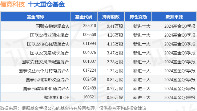 根据2024基金Q3季报公募基金重仓股数据,重仓该股的公募基金共9家,其中持有数量最多的公募基金为国联安稳健混合A。国联安稳健混合A目前规模为1.87亿元,最新净值0.96(12月4日),较上一交易日下跌0.62%,近一年上涨0.94%。该公募基金现任基金经理为储乐延。储乐延在任的基金产品包括:国联安智能制造混合A,管理时间为2023年7月19日至今,期间收益率为-16.65%;国联安核心优势混合A,管理时间为2023年7月19日至今,期间收益率为-15.53%;