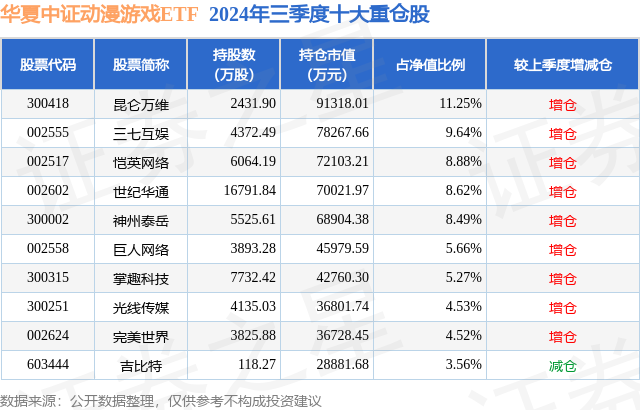 华夏中证动漫游戏ETF的前十大重仓股如下: