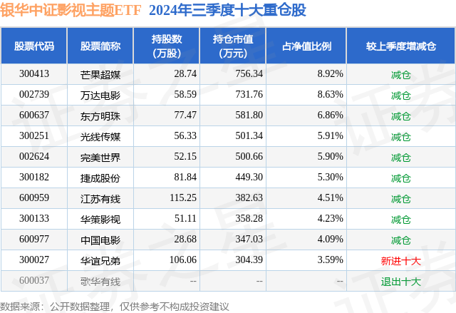 根据2024基金Q3季报公募基金重仓股数据,重仓该股的公募基金共3家,其中持有数量最多的公募基金为银华中证影视主题ETF。银华中证影视主题ETF目前规模为0.85亿元,最新净值0.8723(12月4日),较上一交易日下跌3.46%,近一年下跌4.8%。该公募基金现任基金经理为张亦驰。张亦驰在任的基金产品包括:银华华证ESG领先指数,管理时间为2021年11月23日至今,期间收益率为-6.61%;银华中证农业主题ETF,管理时间为2022年6月20日至今,期间收益率为-28.51%;银华中证内地地产主题ETF,管理时间为2022年11月21日至今,期间收益率为-25.38%。