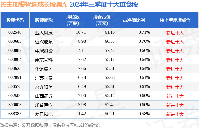 根据2024基金Q3季报公募基金重仓股数据,重仓该股的公募基金共3家,其中持有数量最多的公募基金为民生加银智选成长股票A。民生加银智选成长股票A目前规模为0.64亿元,最新净值1.2031(12月4日),较上一交易日下跌1.14%。该公募基金现任基金经理为蔡晓 杨林。蔡晓在任的基金产品包括:民生加银研究精选混合,管理时间为2018年3月7日至今,期间收益率为56.59%;民生加银养老服务混合,管理时间为2021年12月1日至今,期间收益率为-40.29%;民生加银优选股票,管理时间为2022年12月28日至今,期间收益率为-15.9%;民生加银均衡优选混合A,管理时间为2023年5月5日至今,期间收益率为-15.85%。杨林在任的基金产品包括:民生加银中证500指数增强A,管理时间为2023年11月30日至今,期间收益率为-0.13%;