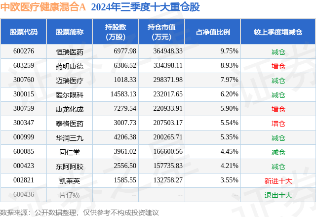 根据2024基金Q3季报公募基金重仓股数据,重仓该股的公募基金共58家,其中持有数量最多的公募基金为中欧医疗健康混合A。中欧医疗健康混合A目前规模为184.44亿元,最新净值1.6213(12月5日),较上一交易日下跌0.62%,近一年下跌14.57%。该公募基金现任基金经理为葛兰。葛兰在任的基金产品包括:中欧明睿新起点混合,管理时间为2018年7月12日至今,期间收益率为23.84%;中欧医疗创新股票A,管理时间为2019年2月28日至今,期间收益率为8.27%。