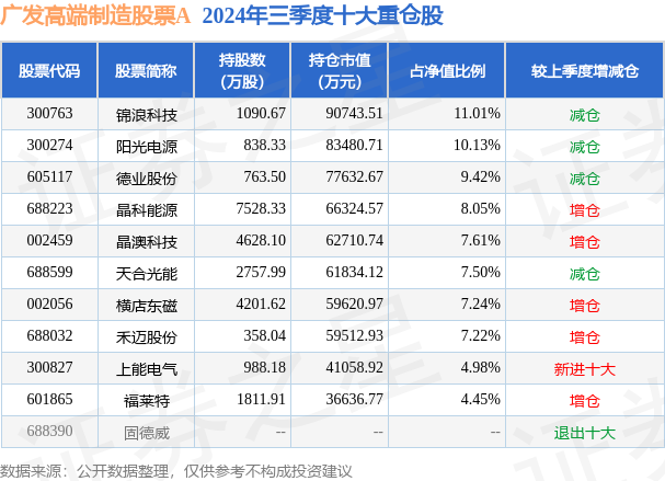 广发高端制造股票A的前十大重仓股如下: