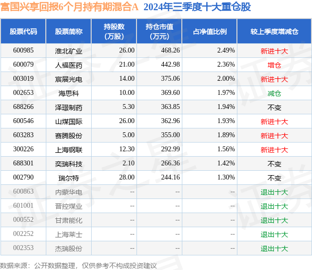 富国兴享回报6个月持有期混合A的前十大重仓股如下: