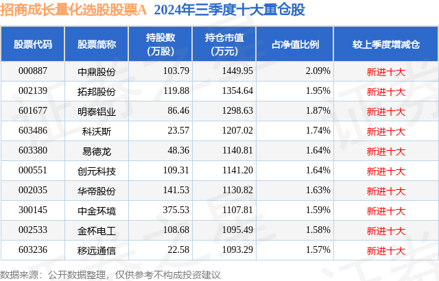 根据2024基金Q3季报公募基金重仓股数据,重仓该股的公募基金共3家,其中持有数量最多的公募基金为招商成长量化选股股票A。招商成长量化选股股票A目前规模为1.32亿元,最新净值1.1187(12月5日),较上一交易日上涨0.67%。该公募基金现任基金经理为王平。王平在任的基金产品包括:招商量化精选股票A,管理时间为2016年3月15日至今,期间收益率为169.89%;招商沪深300指数增强A,管理时间为2017年2月10日至今,期间收益率为52.77%;招商中证1000指数增强A,管理时间为2017年3月3日至今,期间收益率为57.53%;招商中证红利ETF,管理时间为2019年11月28日至今,期间收益率为92.51%。