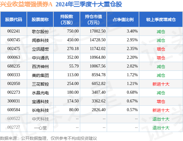 根据2024基金Q3季报公募基金重仓股数据,重仓该股的公募基金共9家,其中持有数量最多的公募基金为兴业收益增强债券A。兴业收益增强债券A目前规模为40.51亿元,最新净值1.419(12月5日),较上一交易日上涨0.0%,近一年上涨9.4%。该公募基金现任基金经理为周鸣 丁进。周鸣在任的基金产品包括:兴业定开债A,管理时间为2014年3月13日至今,期间收益率为80.34%;兴业稳固收益一年理财债券,管理时间为2020年12月3日至今,期间收益率为9.74%;兴业添利债券,管理时间为2021年5月25日至今,期间收益率为14.19%。丁进在任的基金产品包括:兴业年年利定开债,管理时间为2015年7月6日至今,期间收益率为51.72%;兴业稳康三年定开债券,管理时间为2017年1月20日至今,期间收益率为22.4%;兴业聚华混合A,管理时间为2020年3月20日至今,期间收益率为43.88%。