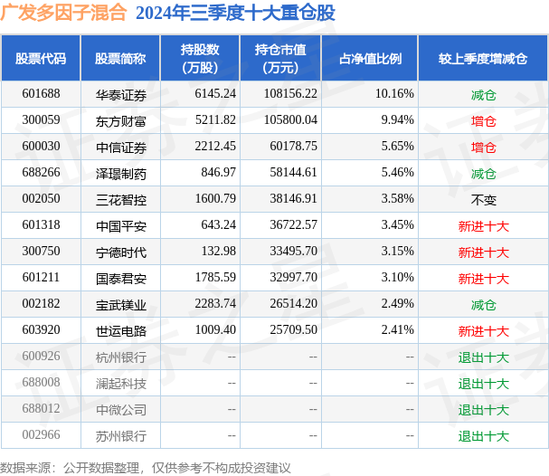 广发多因子混合的前十大重仓股如下: