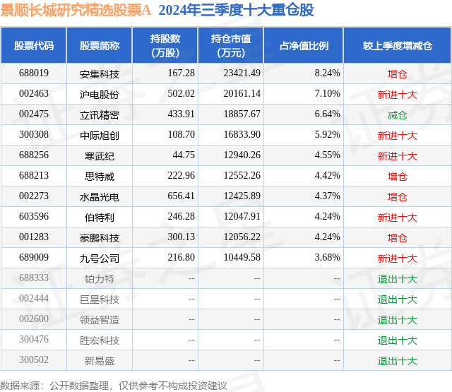根据2024基金Q3季报公募基金重仓股数据,重仓该股的公募基金共4家,其中持有数量最多的公募基金为景顺长城研究精选股票A。景顺长城研究精选股票A目前规模为11.24亿元,最新净值1.553(12月6日),较上一交易日上涨1.04%,近一年上涨28.03%。该公募基金现任基金经理为张雪薇。张雪薇在任的基金产品包括:景顺长城电子信息产业股票A,管理时间为2022年5月25日至今,期间收益率为19.77%;