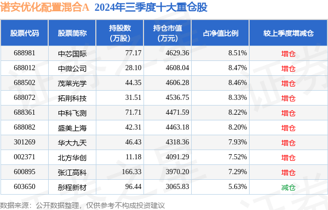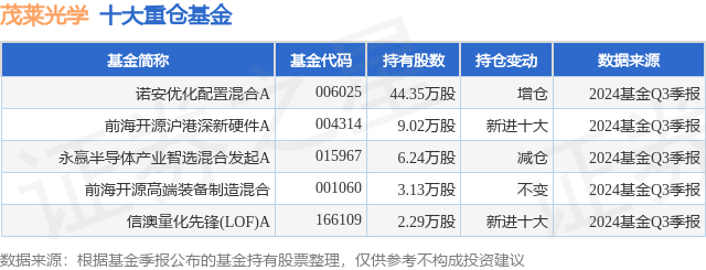根据2024基金Q3季报公募基金重仓股数据,重仓该股的公募基金共5家,其中持有数量最多的公募基金为诺安优化配置混合A。诺安优化配置混合A目前规模为2.3亿元,最新净值1.9358(12月6日),较上一交易日上涨0.55%,近一年上涨27.56%。该公募基金现任基金经理为刘慧影。刘慧影在任的基金产品包括:诺安成长混合,管理时间为2023年2月18日至今,期间收益率为6.97%;诺安积极回报混合A,管理时间为2023年9月29日至今,期间收益率为31.31%。