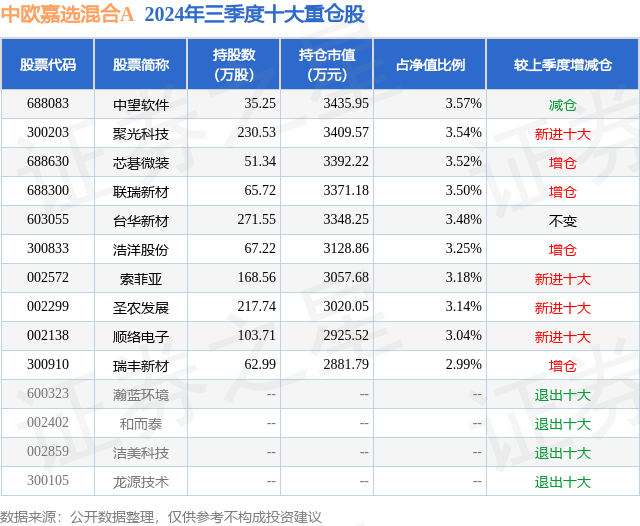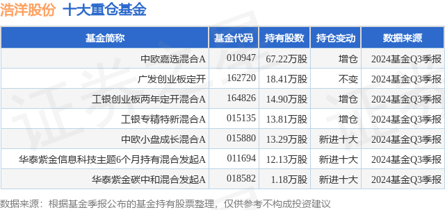 根据2024基金Q3季报公募基金重仓股数据,重仓该股的公募基金共7家,其中持有数量最多的公募基金为中欧嘉选混合A。中欧嘉选混合A目前规模为9.08亿元,最新净值0.6632(12月9日),较上一交易日下跌0.63%,近一年下跌3.01%。该公募基金现任基金经理为王健。王健在任的基金产品包括:中欧新动力混合(LOF)A,管理时间为2016年11月3日至今,期间收益率为82.01%;中欧嘉泽灵活配置混合,管理时间为2018年1月26日至今,期间收益率为96.99%;中欧嘉和三年混合A,管理时间为2020年5月28日至今,期间收益率为-4.19%;中欧均衡成长混合A,管理时间为2020年12月11日至今,期间收益率为-27.46%。