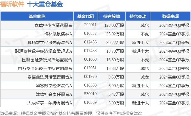 根据2024基金Q3季报公募基金重仓股数据,重仓该股的公募基金共22家,其中持有数量最多的公募基金为泰信中小盘精选混合。泰信中小盘精选混合目前规模为8.43亿元,最新净值3.21(12月9日),较上一交易日下跌0.43%,近一年上涨12.04%。该公募基金现任基金经理为董季周。董季周在任的基金产品包括:泰信鑫选灵活配置混合A,管理时间为2020年11月24日至今,期间收益率为-16.17%。